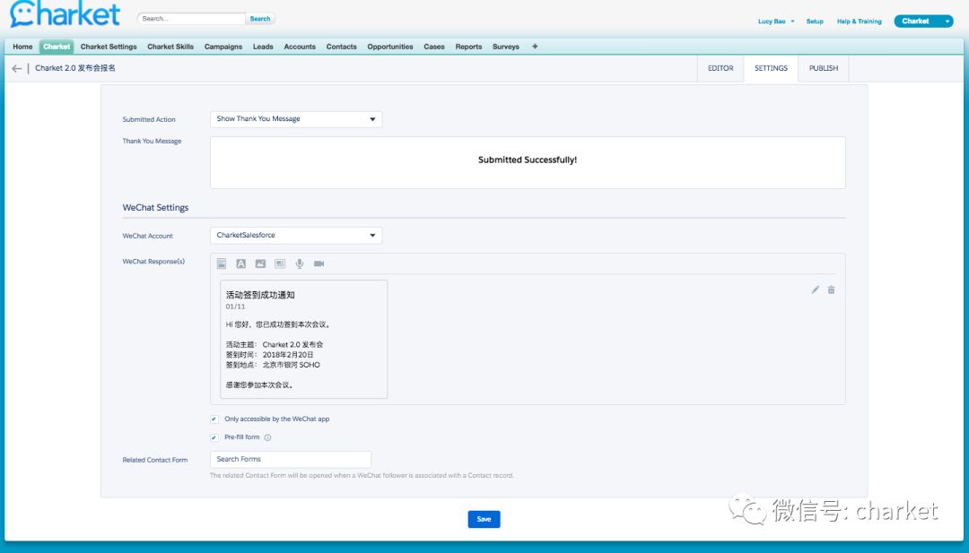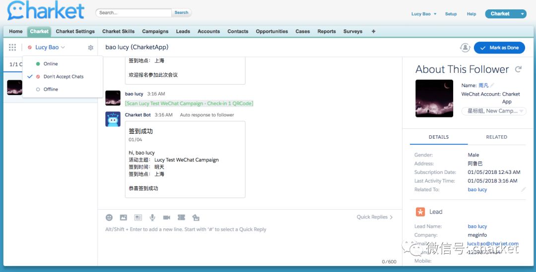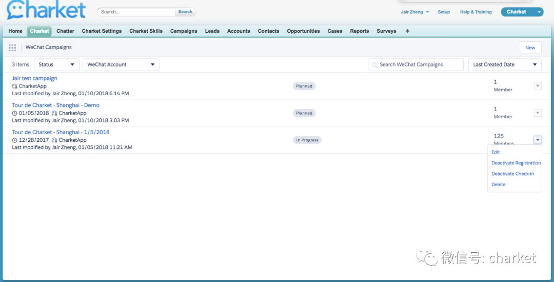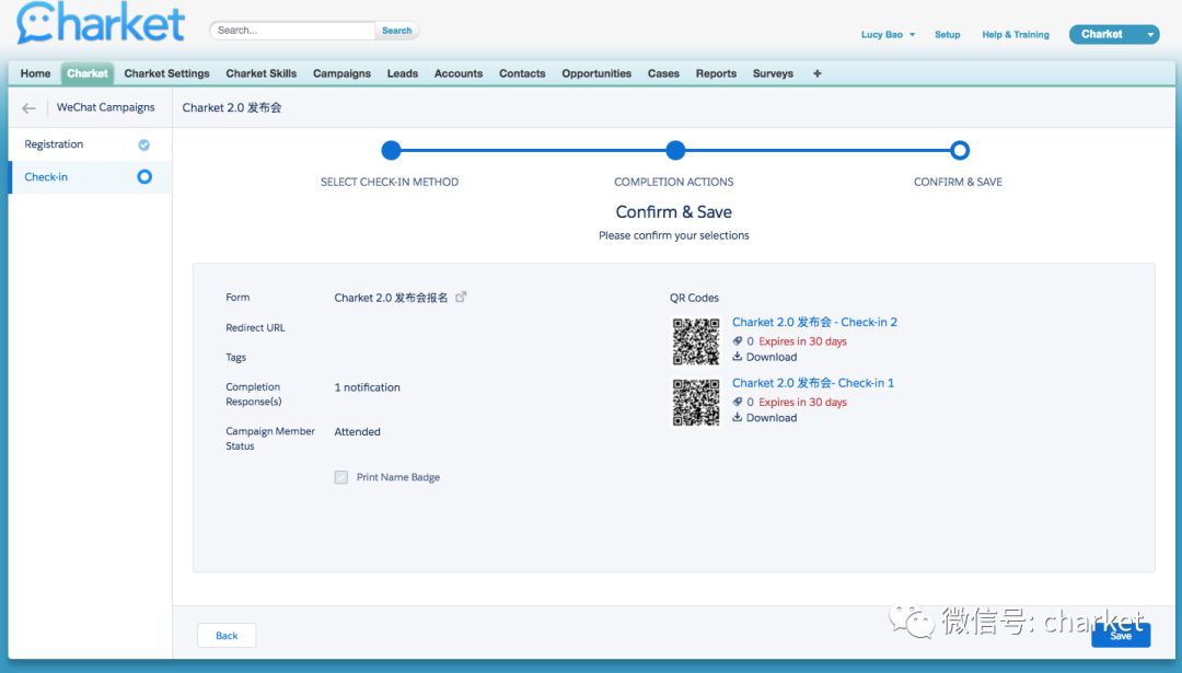 WeChat Campaign 是我们在 Salesforce Campaign 模块基础上开发的微信扩展功能,它让 Salesforce 的市场活动拥有了微信的扩展能力。利用微信提供的二维码功能完成传统市场活动的推广、报名、会前提醒、签到打印和会后的问卷调查等一系列操作。通过让客户完成扫描二维码等操作,Charket 可以让客户信息自动进入 Salesforce 系统,同时把客户直接加入到 Salesforce 的 Campaign 中,自动化的实现了客户行为数据的全面维护。