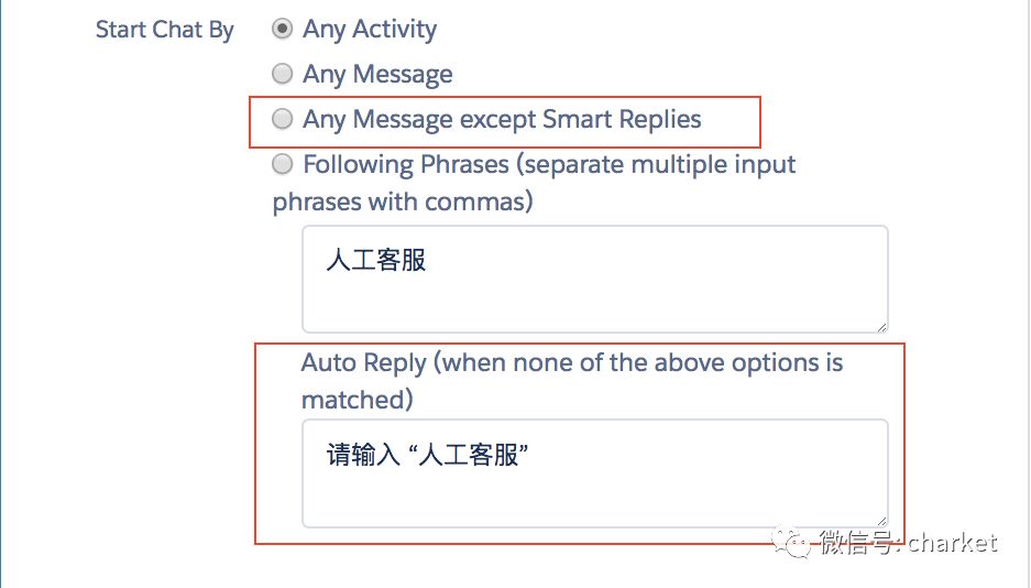 Start Chat By 是一个很强大的设置,此设置避免了关注者无关请求的,节省了客服资源。设置 Any Message except Smart Replies 可以阻止关注者触发关键词回复后自动接入到客服聊天列表中。设置 Auto Reply,(如:“请输入人工客服”)来提示关注者如何接入人工客服。如图所示: