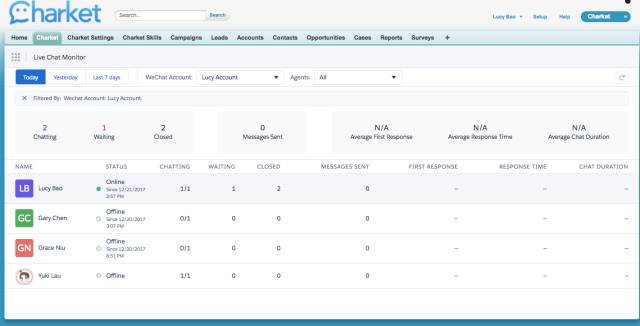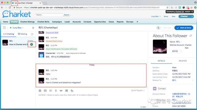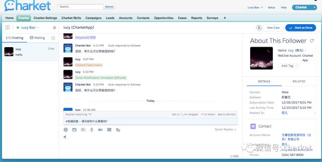 如果想了解到具体每个客服的信息,可以到 Monitor Detail 页面查看客服和关注者的聊天记录。也可以查看关注者的第一次请求时间、 Lead 或 Contact 的信息以及相关的 Campaign, Opportunity 和 Case 的信息。