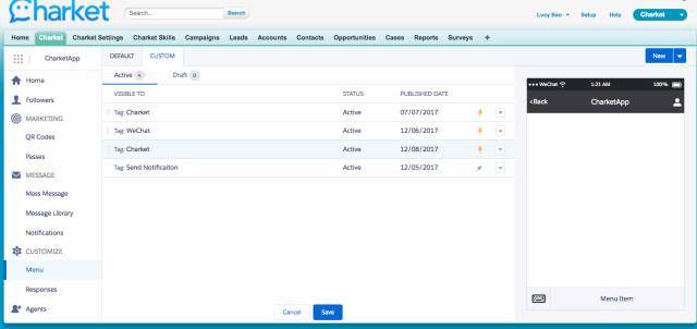 经过团队三个多月的努力,Charket 全新的 2.0 版本在 2018 年初正式发布了!本次更新包括了全新的微信市场活动管理模块 - WeChat Campaign、自定义数据收集模块 - Form Builder、全面的客服数据监测模块 - Live Chat Monitor、同时还有自定义菜单、Live Chat 等多达几十项的增强和改进。下面给大家重点介绍本次升级的亮点功能。