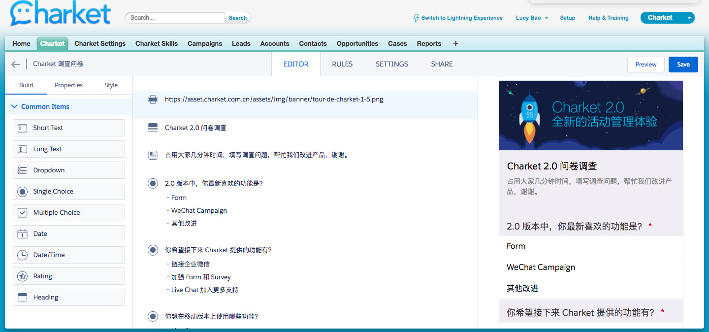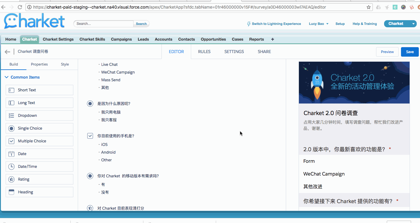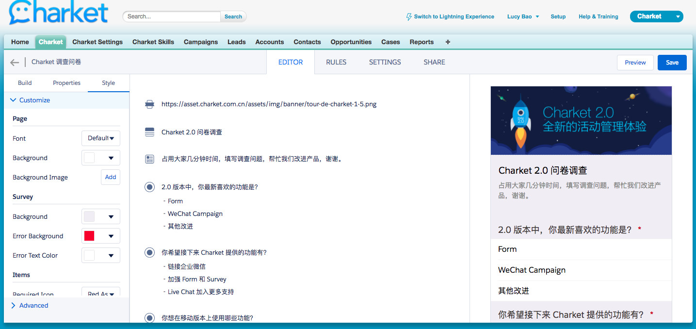 - 问卷编辑器。 在以前版本中,虽然我们也有 Survey,但是用户只能通过在 Salesforce 中的标准页面来录入问题和选项。很明显,这种操作对用户在创建数据和维护问卷是很不方便的。因此,新版本加入了全新的问卷 Builder,实现了所见即所得的创建效果,用户可通过拖拽的方式轻松构建问卷。