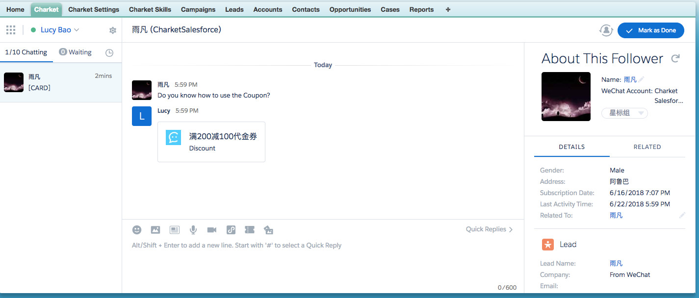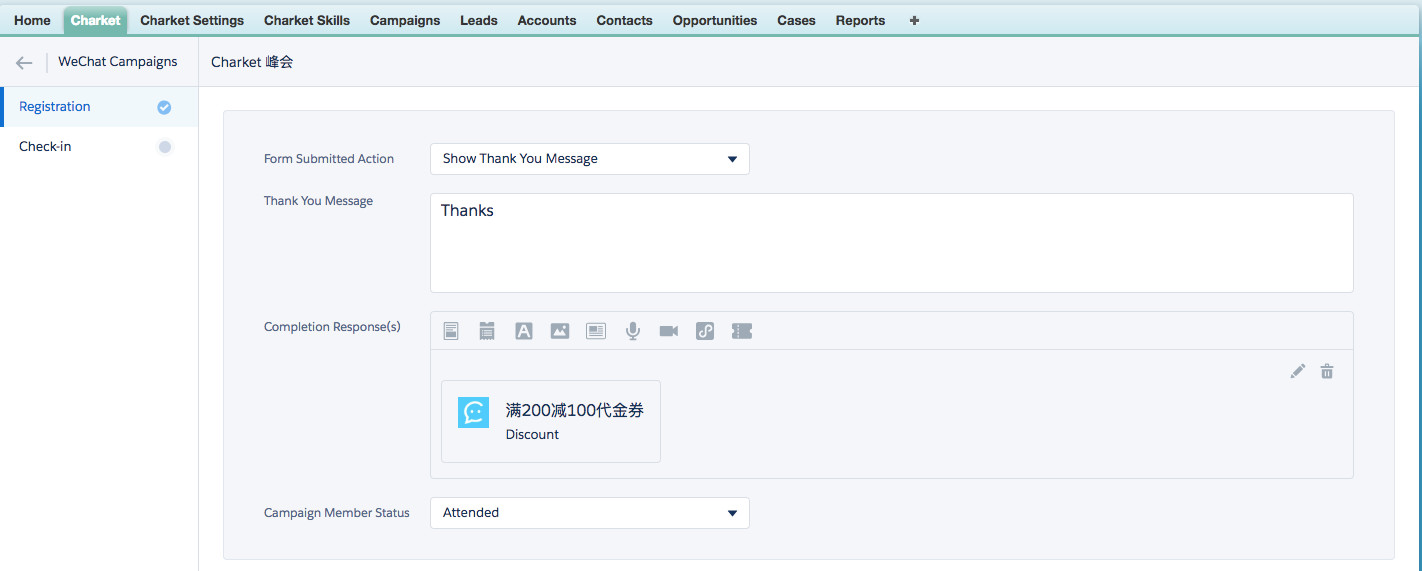 相信大家对线下纸质优惠券的营销模式已经耳熟能详,在如今移动互联网时代,微信给大家提供了电子版的优惠券功能 - 微信卡券。该功能为企业提供了一种全新的营销模式,很多企业已经成功应用。Charket 在此版本中完善了微信卡券模块,该模块实现了微信卡券的同步、投放、领取和核销等功能。把客户从领取到核销的整个过程产生的数据,实时同步到 Salesforce 中,完善客户数据,助力企业打造更全面的客户画像。