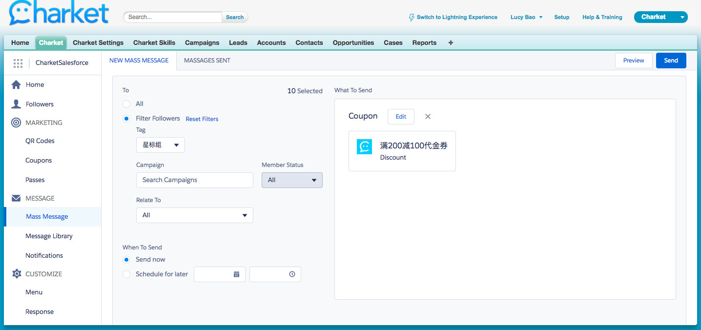 - 群发功能: 使用 Charket 群发功能将卡券群发给指定的客户群。