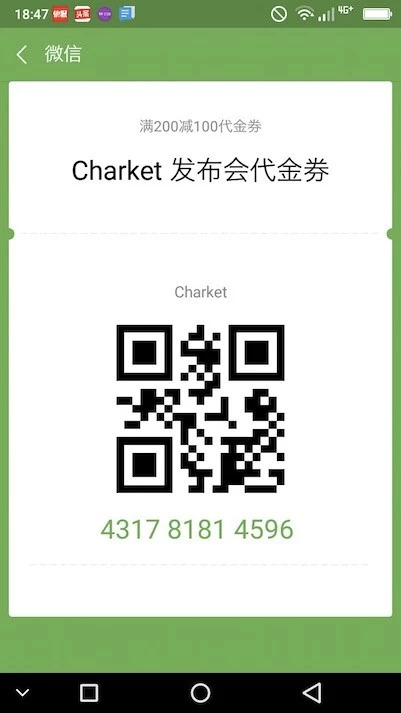 在 Charket 中,微信卡券是通过微信后台来生成,然后同步到 Salesforce 并显示在 Charket 的卡券列表中。商户可以在列表界面查看卡券的类型、状态、库存、还可以修改卡券库存和删除卡券等操作。商户制作微信卡券后,可以下发到用户的微信中,当用户领取卡券后,商户可以扫描卡券的二维码或条形码来核销卡券以供用户消费使用。