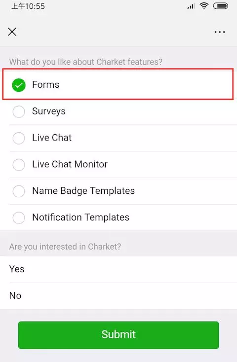 如果设置上图中的 URL Parameter 的参数 charket 的值为相关问题的答案 Forms,在移动端打开问卷后的显示如下图: