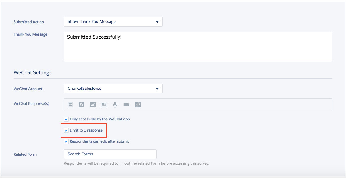 创建完 Survey 后,在 Settings 页面通过对 Limit to 1 response 的设置来控制创建的记录为多个还是单个。