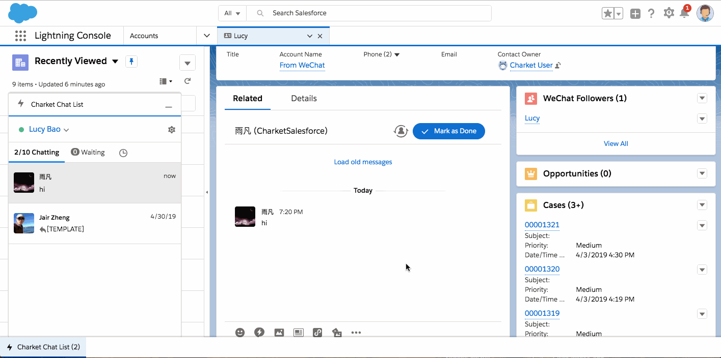为了更好的让客户在 Lightning 环境下使用 Charket,Charket 团队耗时 3 个多月,添加了两个全新的 Live Chat 组件。通过新添加的组件,销售和客服可以在 Lightning Console 中和客户(Lead, Contact 和 Person Account)直接沟通,同时在非 Console 环境下,直接查看聊天记录,全方面提升销售和客服的工作效率。