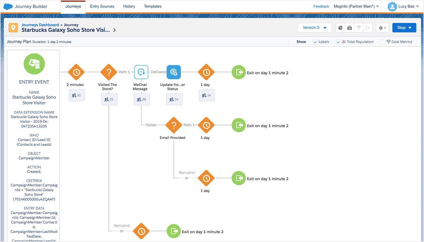 新版本中,企业可以在 Marketing Cloud 的 Journey Builder 内,灵活的配置在什么时间、什么条件下自动推送微信消息给特定的客户。推送内容包括模板消息、文本、图片、图文、语音、视频、卡券、凭证和小程序卡片,为每个客户提供下一步最佳行动,帮助企业细分市场来推动增长。