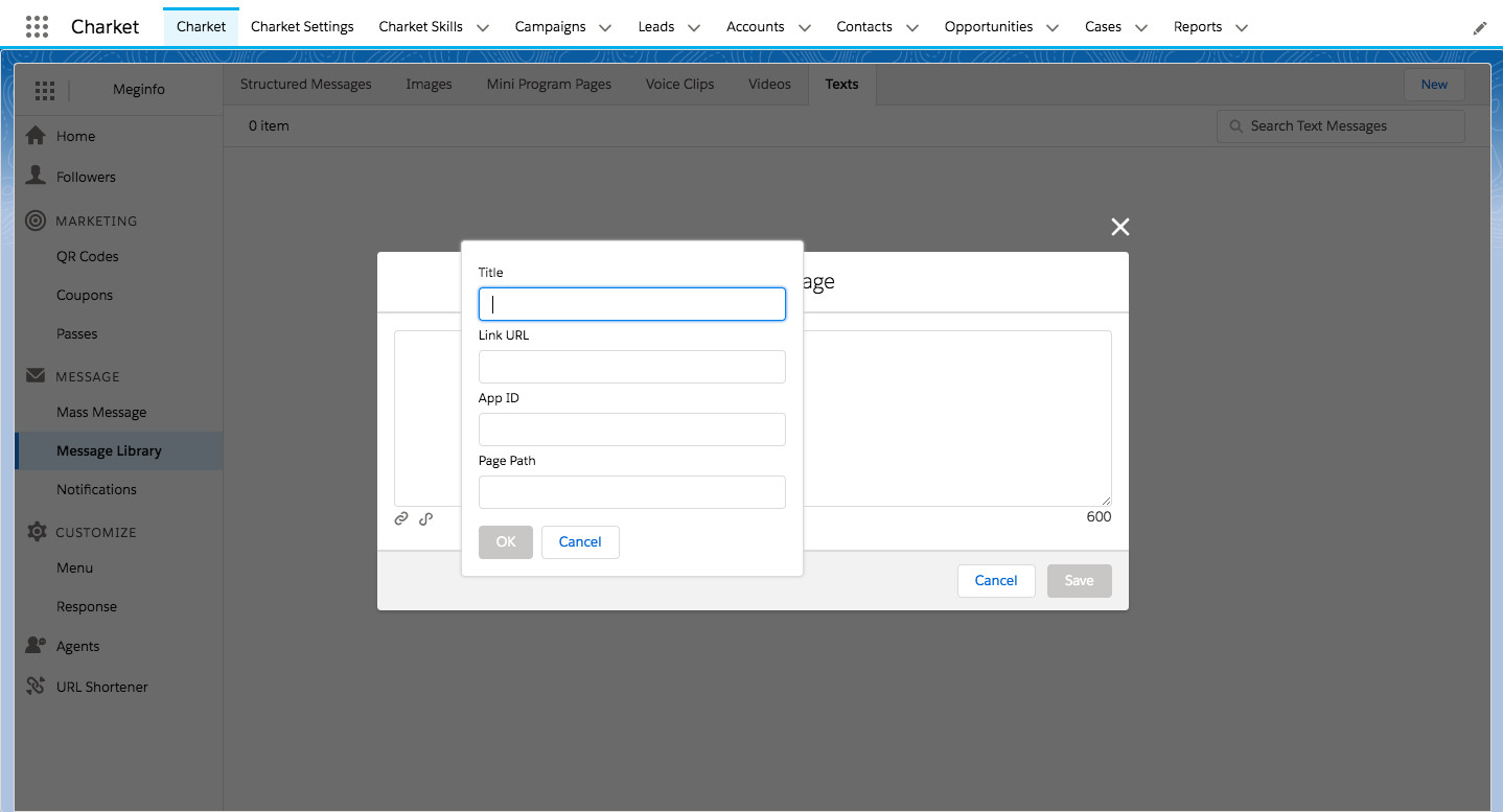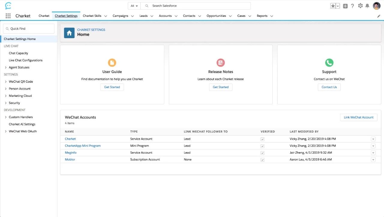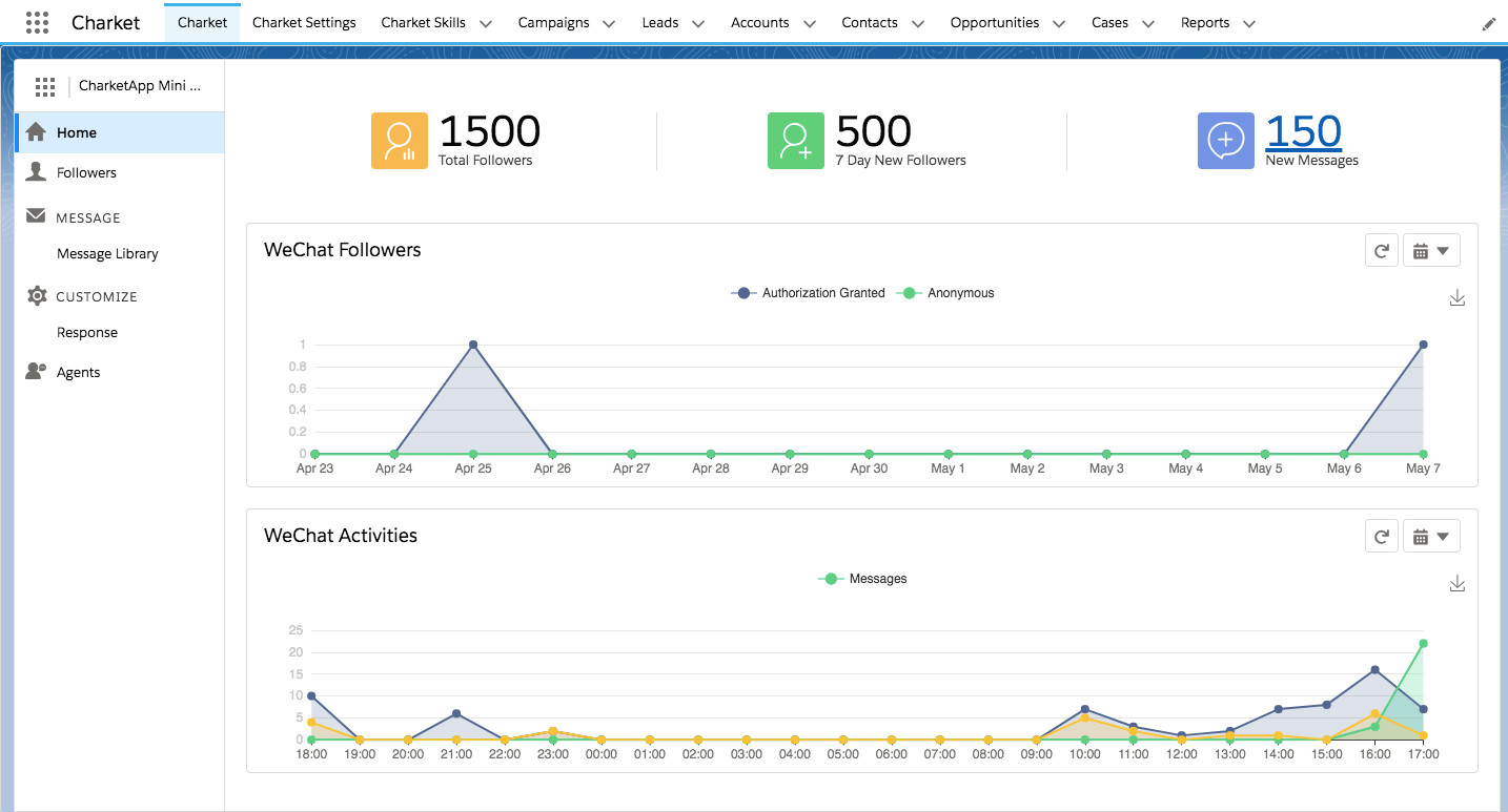 为了能帮助企业把小程序的数据带入到 Salesforce 中,Charket 新版本支持添加小程序,为小程序提供用户管理,自动回复和客户服务的功能。企业可以利用这些功能让小程序成为 CRM 的一个新的数据入口。