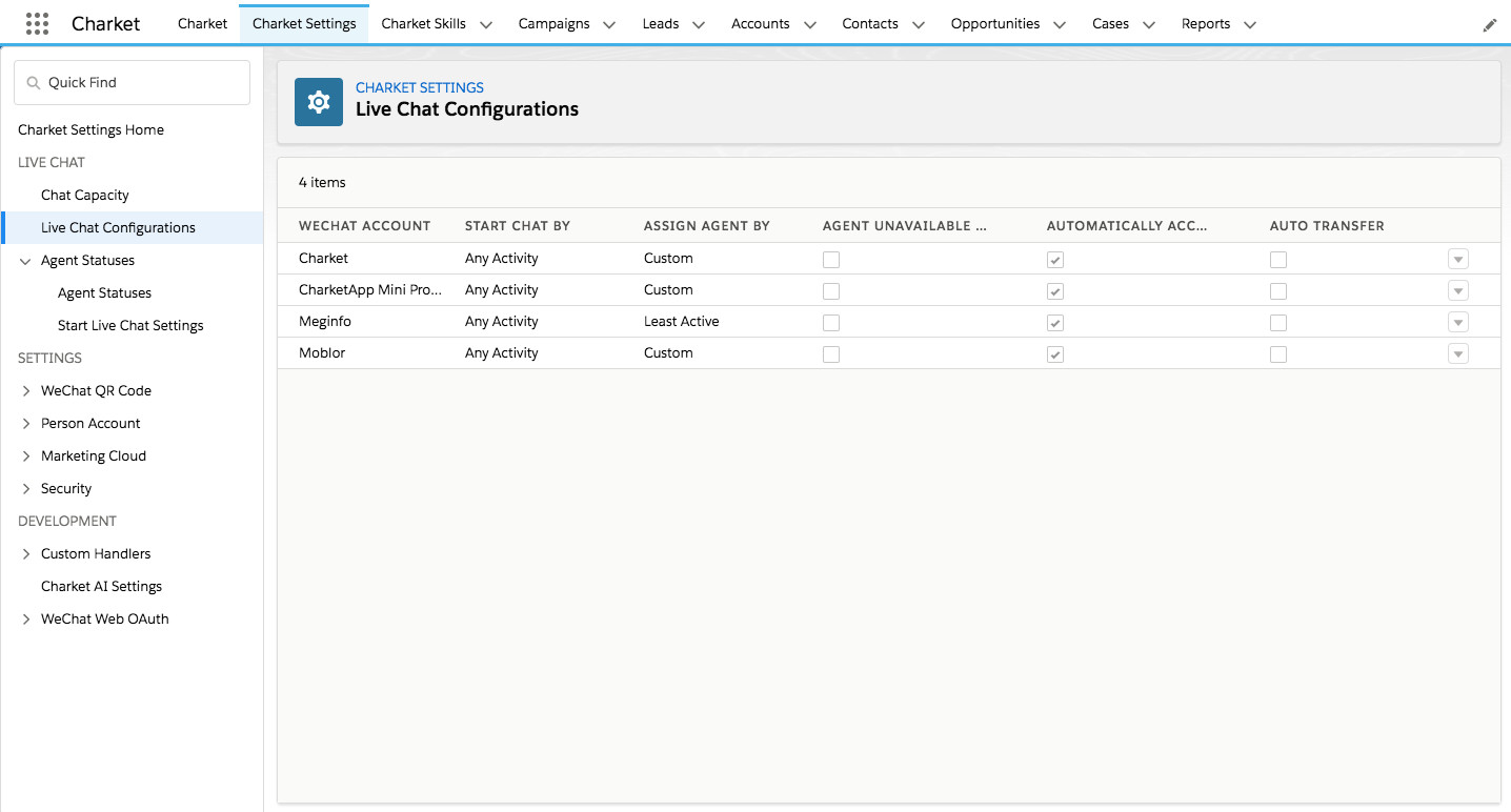 该功能可以在 Charket Settings 页面对每个公众号进行 Live Chat 相关功能的单独配置,包括会话的接入方式、分配和重新分配规则,同时增强了自动回复内容,支持文本、图片、图文、语音和视频多种格式的随机回复。