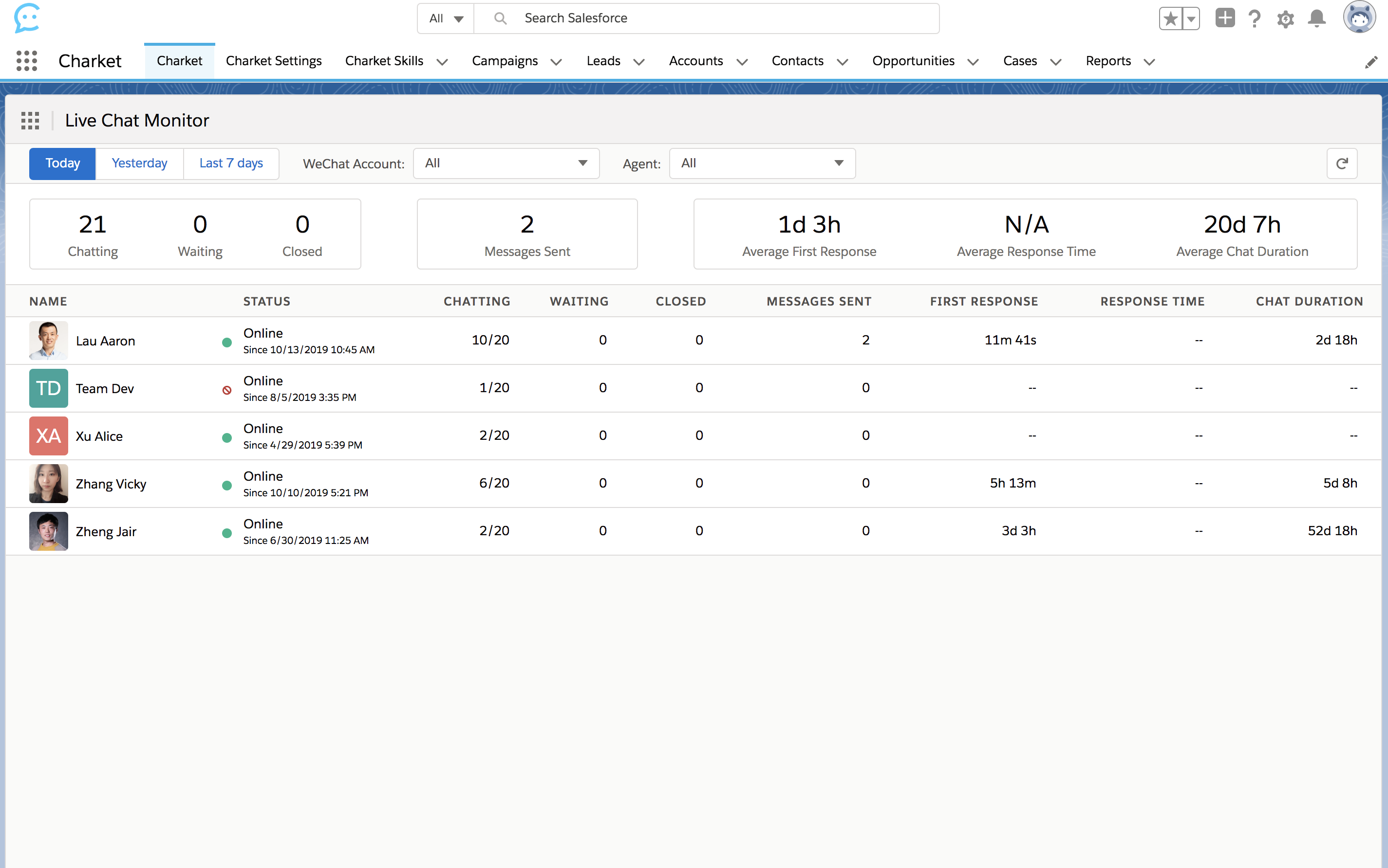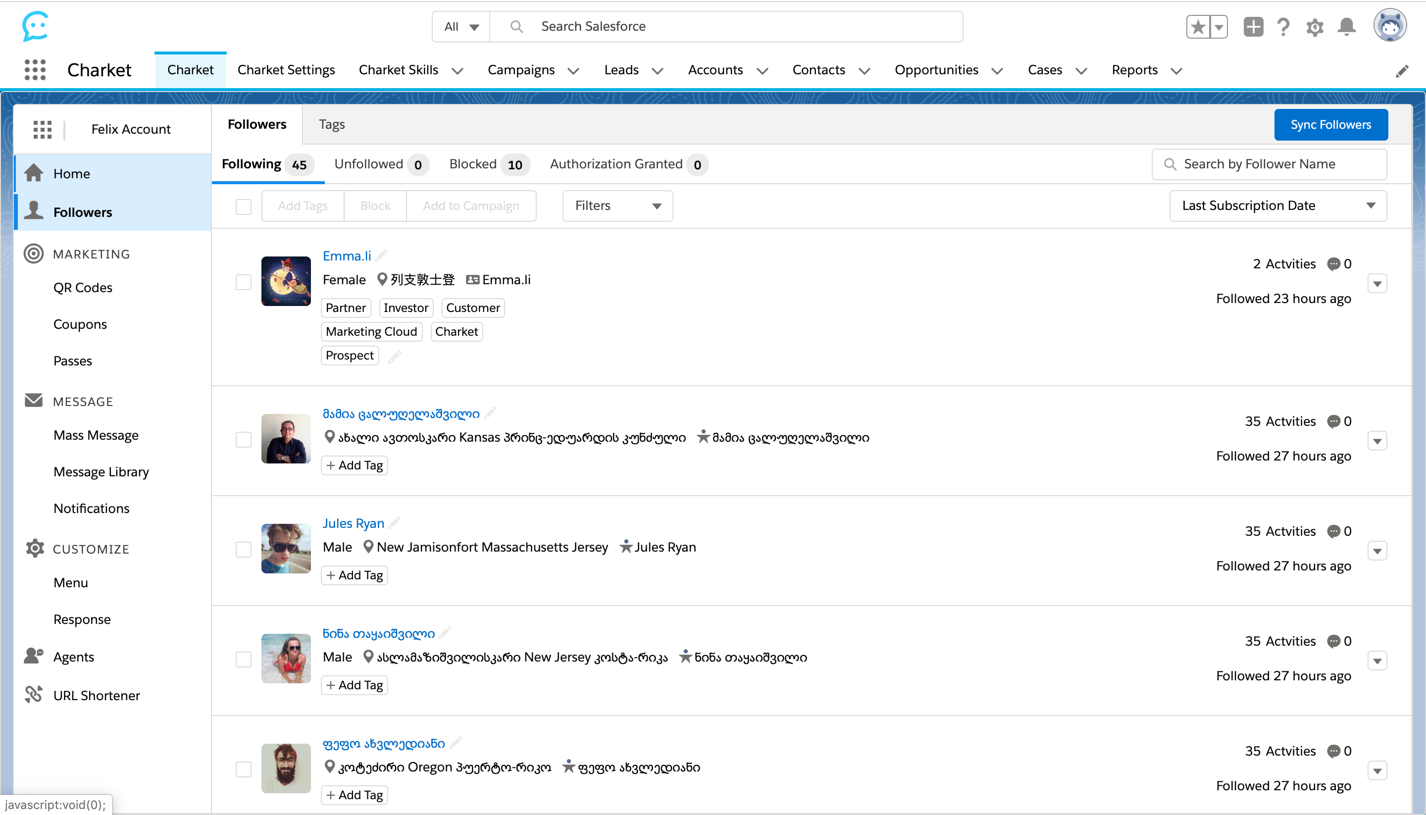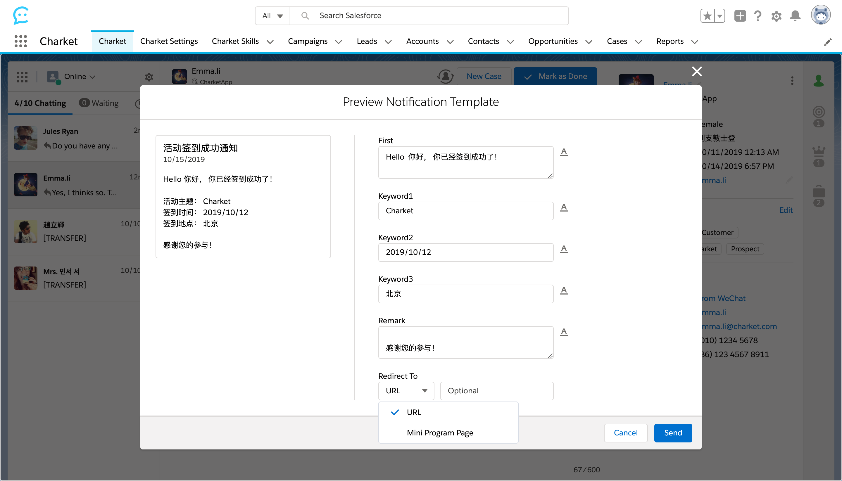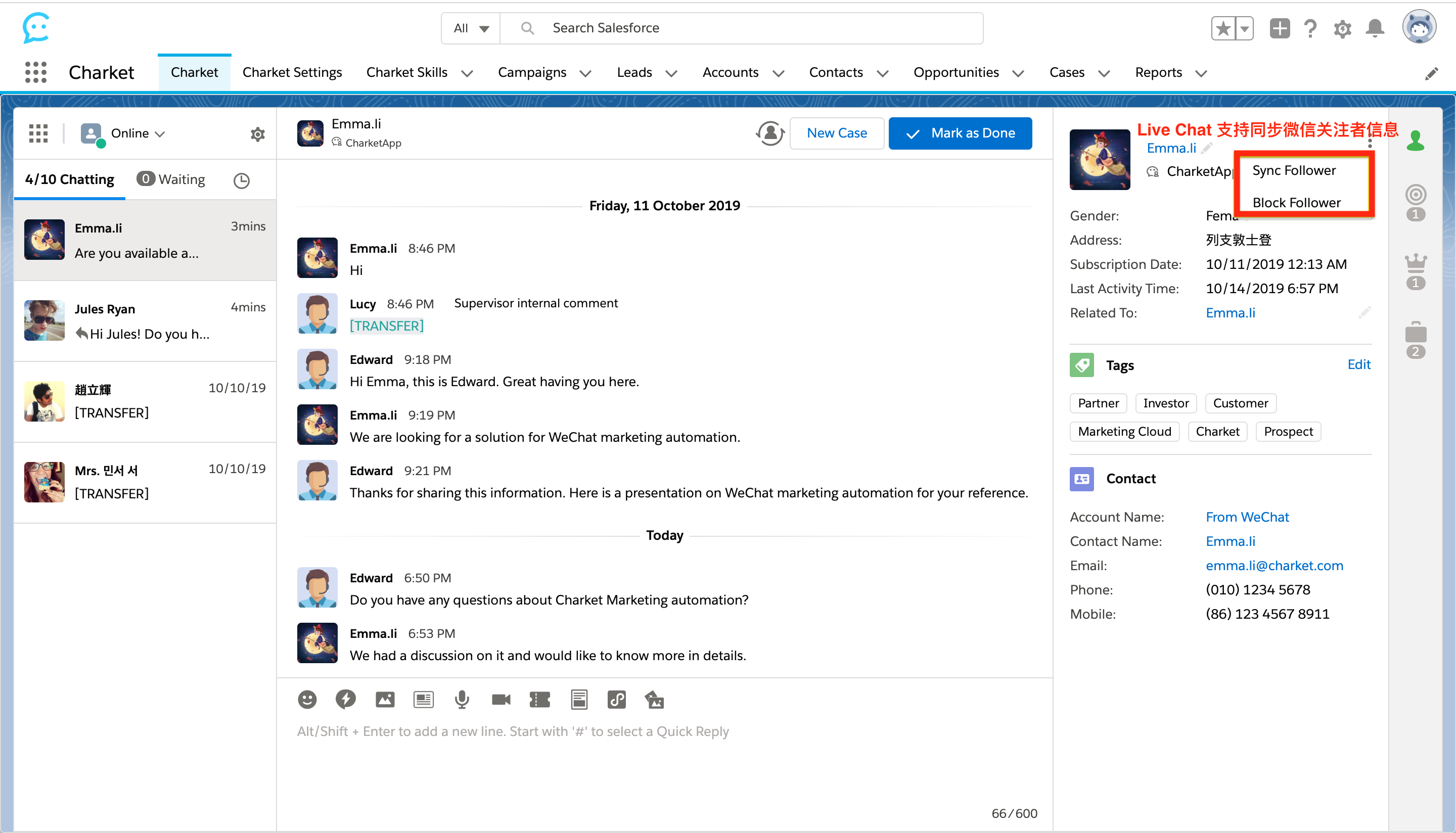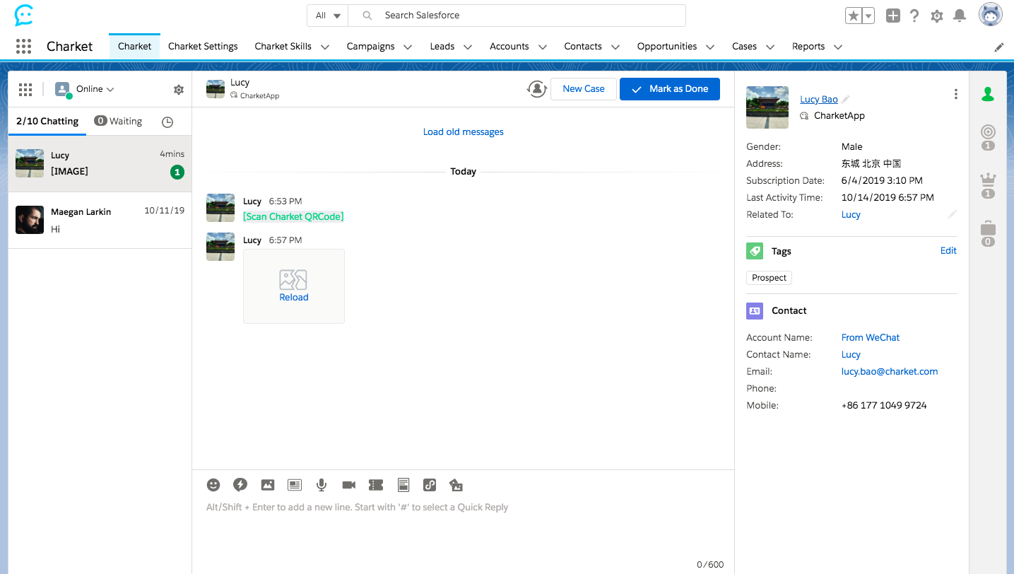 一目了然显示客服当前的在线/离线等状态,同时,完整显示 Follower 的标签以及所关联的 Lead / Contact 资料,客户相关的 Campaigns / Opportunities / Cases 分别以图标形式位列右侧边栏,无需通过多次点击才能进入具体数据列表,以便捷的查看方式改善用户体验。