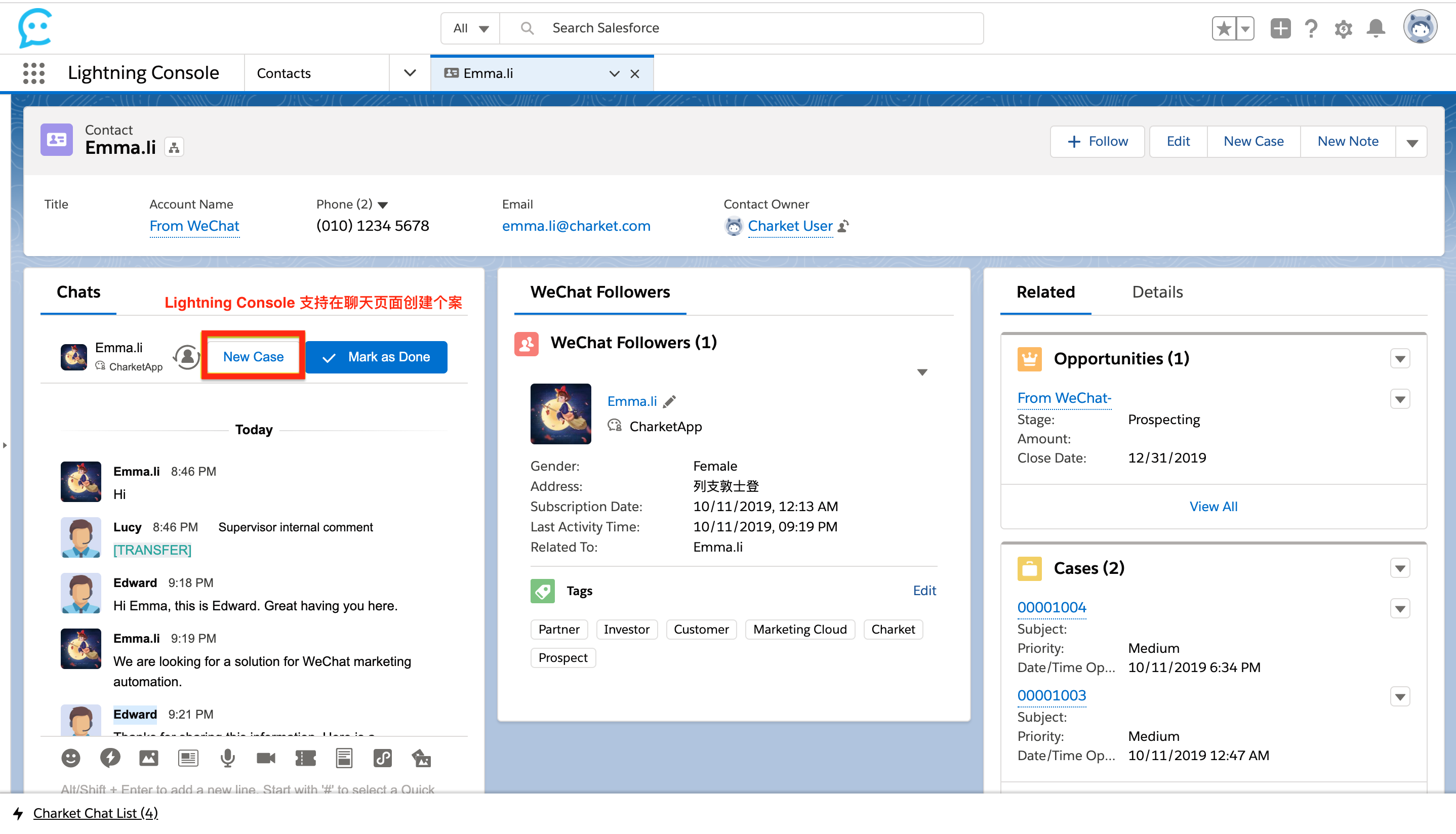 新增 Lightning Console 支持在聊天页面创建 Case,减少在不同操作环境下的切换。