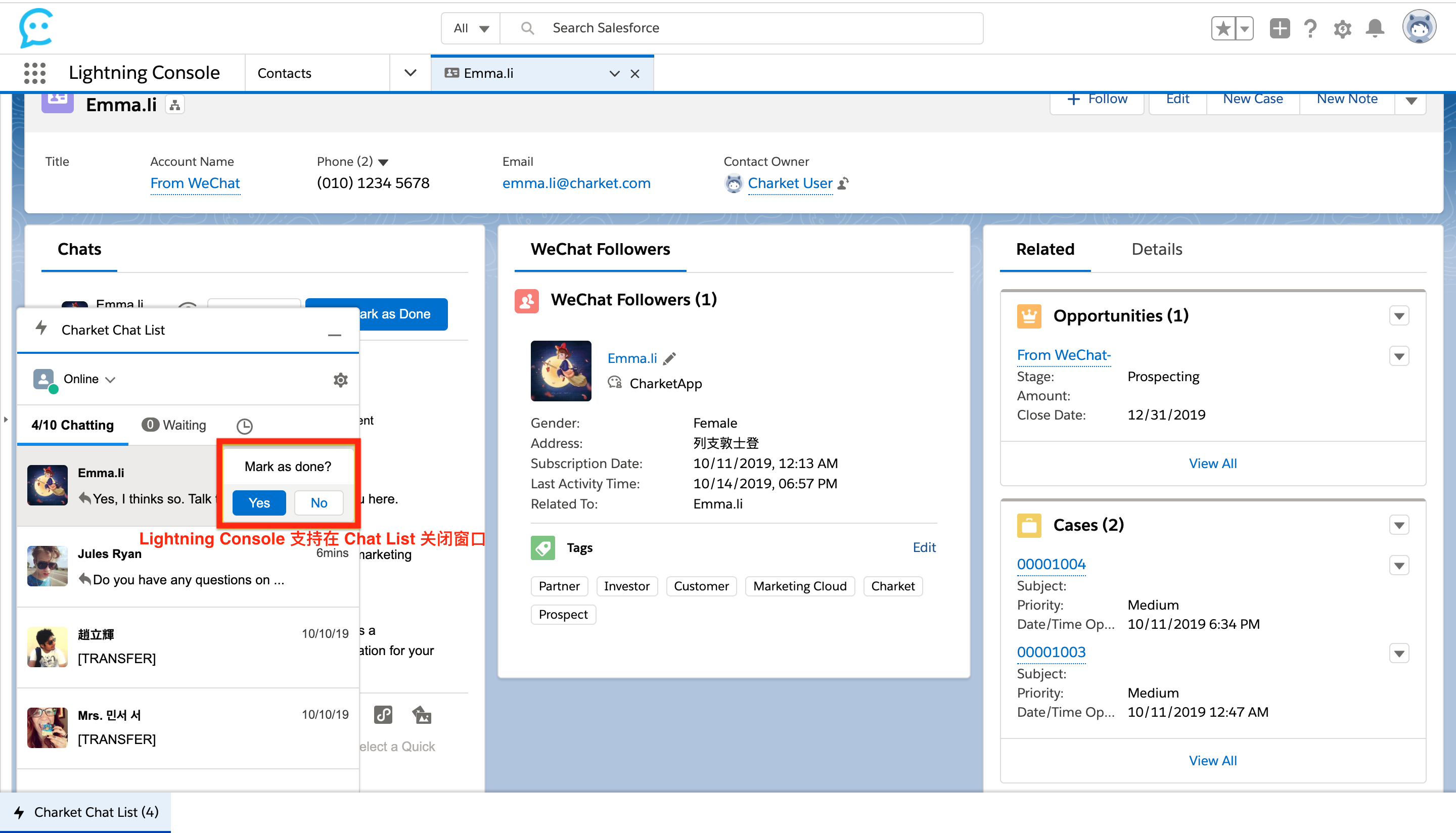 上一个版本中,Lightning Console 环境下关闭聊天窗口需打开 Chats,点击 “Mark as Done” 完成操作。本次更新增加了在 Chat List 中直接关闭当前聊天窗口的选项,并设置了弹窗进行二次点击确认,防止误操作。