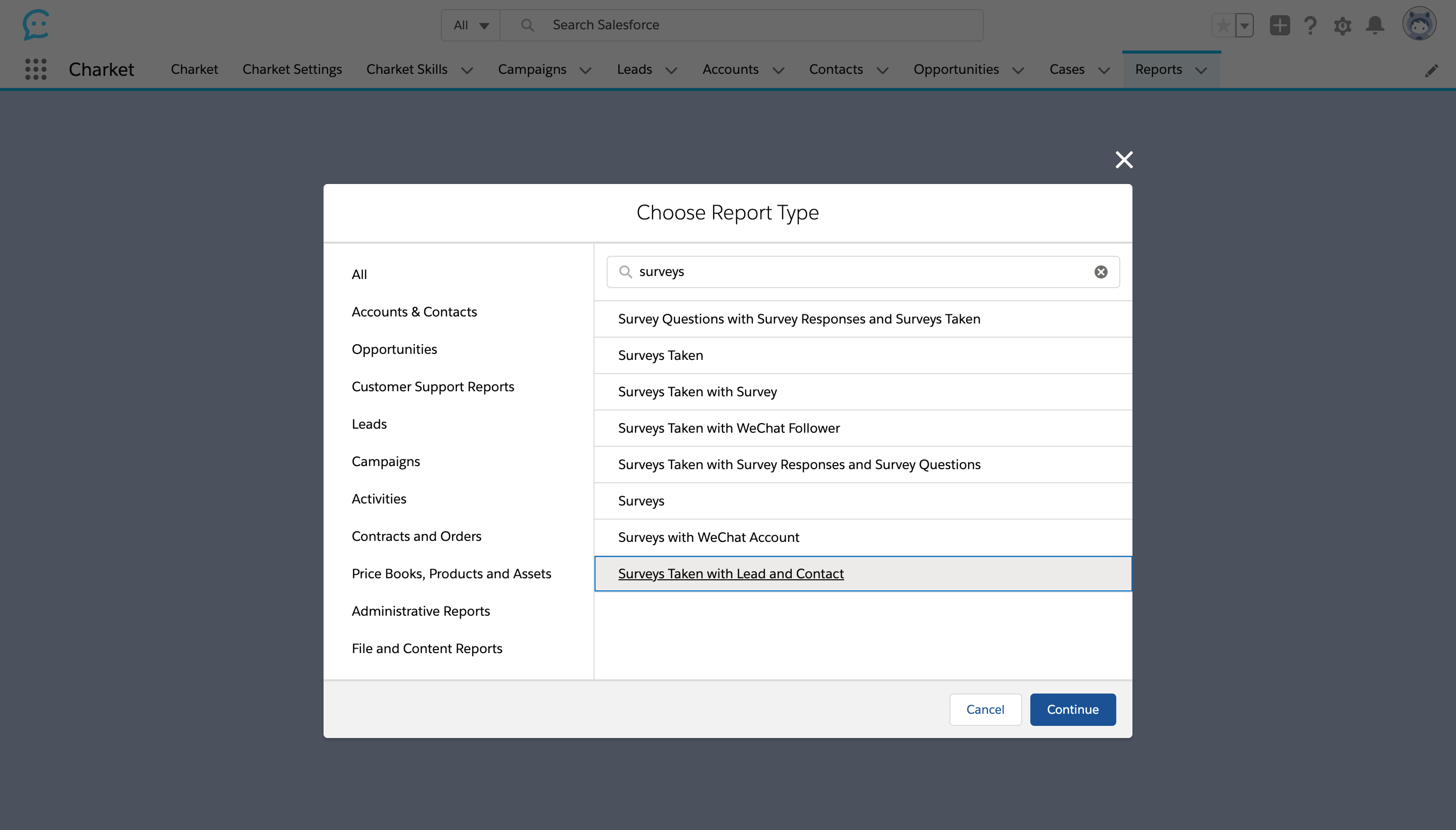 Report Type 选项中新增 “Surveys Taken with Lead and Contact”。