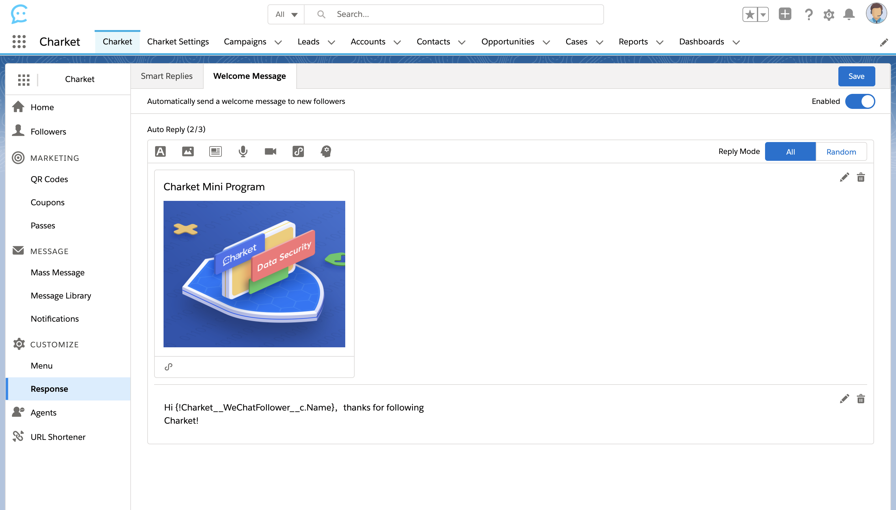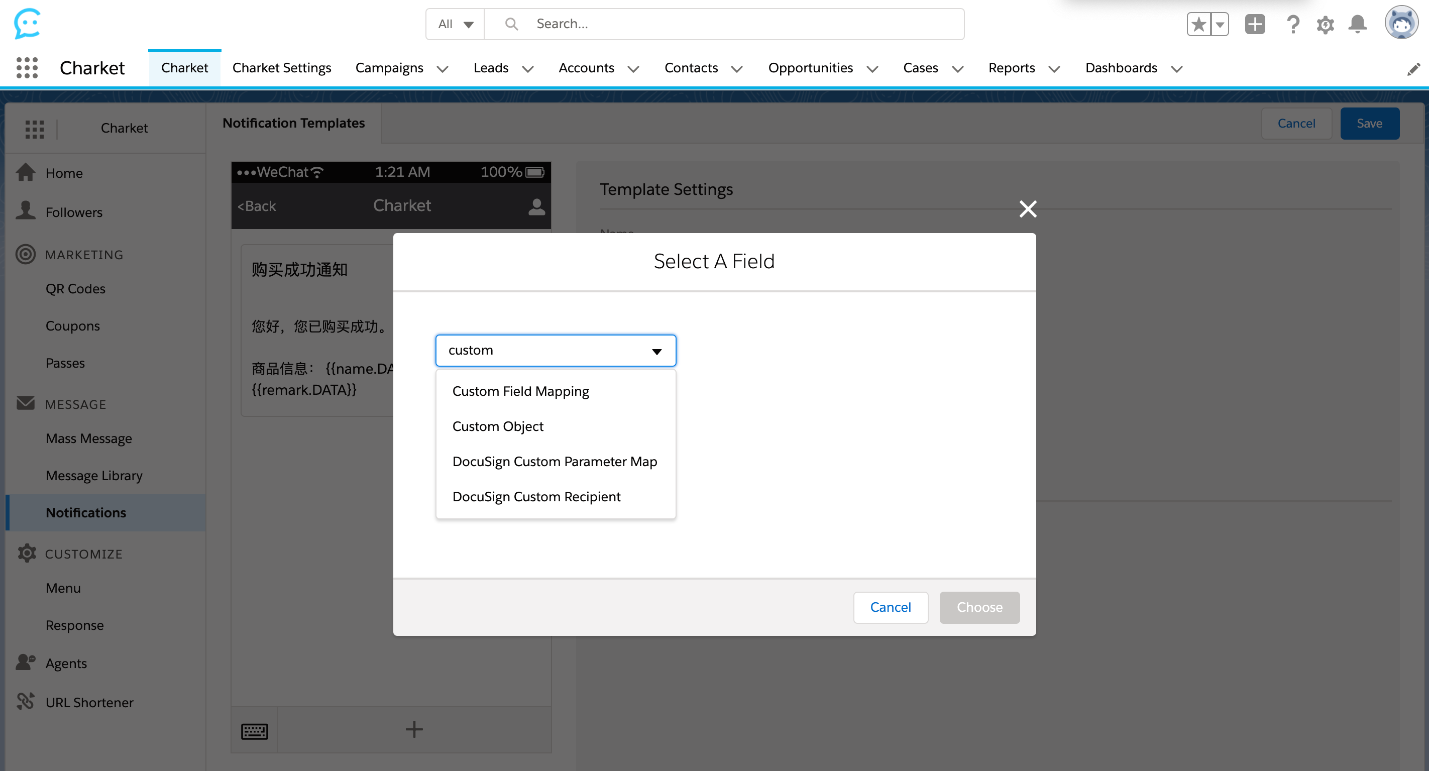 在旧版本中,模板消息的 Merge Field 选择器只支持限定的对象,匹配不到自定义对象,只能通过在输入框中手动输入来实现。升级 v4.3 版本后,Merge Field 选择器将支持客户添加的自定义对象,更方便实现客户的个性化需求。