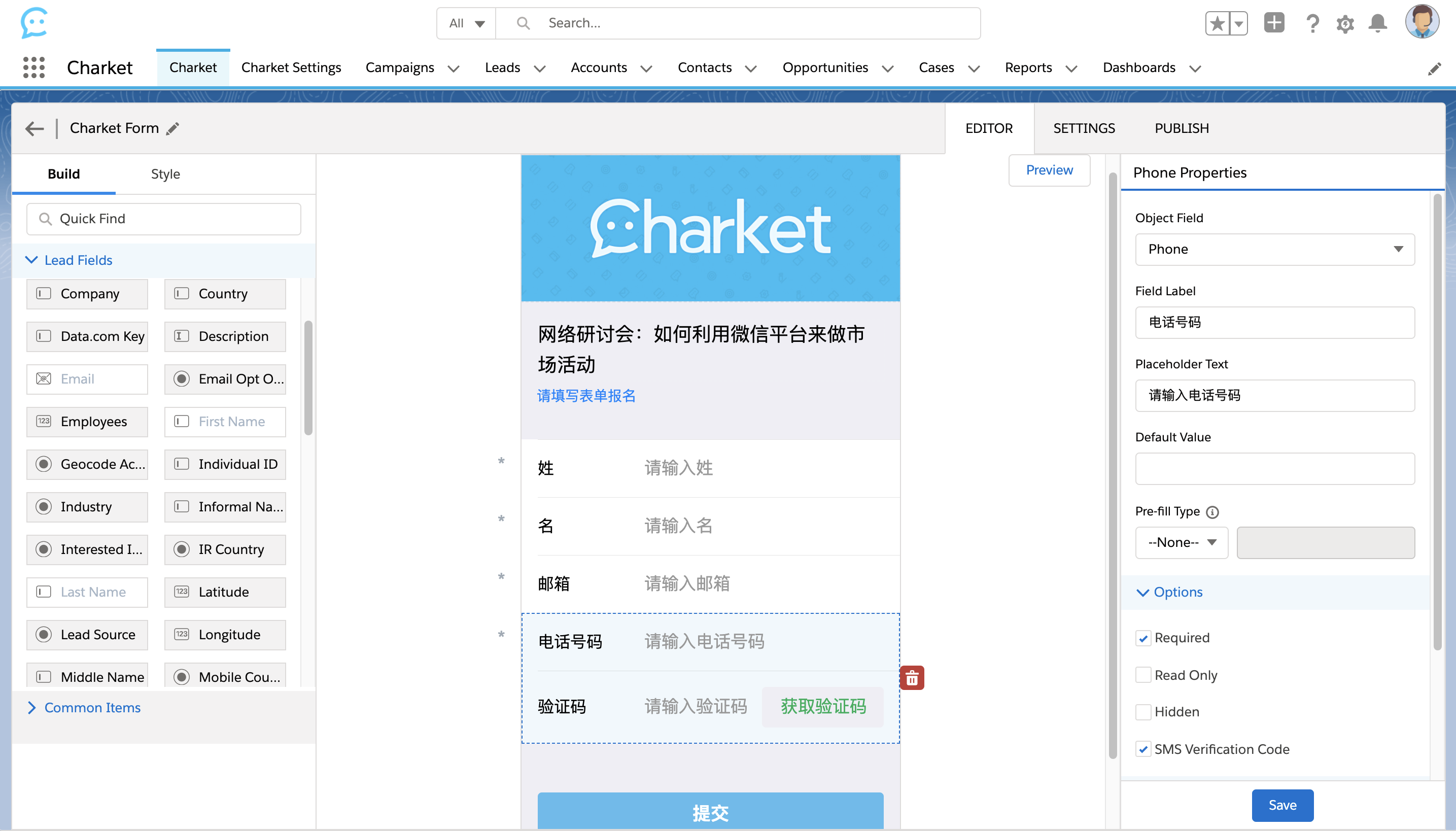 在全新的 v4.3 版本中,Form 中的 Phone 类型字段将支持发送短信验证码,用户在表单中点击“获取验证码”后, 需填入通过短信收到的验证码后再提交表单。增加此验证步骤,可确保 Lead / Contact 手机号码的准确性,提升数据质量。