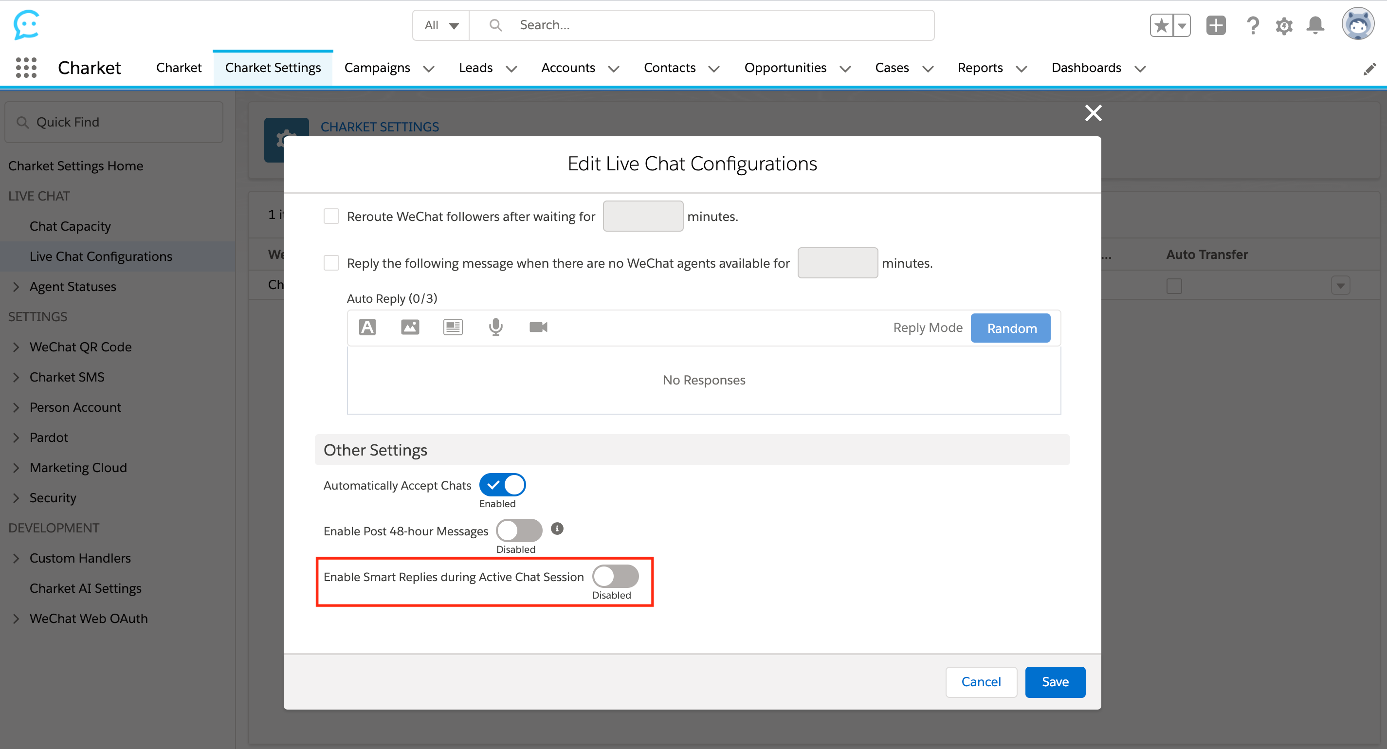本次版本更新后,可在 Live Chat Configurations 页面开启或关闭 Enable Smart Replies during Active Chat Session,用以控制是否在 Live Chat 聊天过程中触发 Smart Replies。关闭此选项后,微信用户在和客服聊天的过程中,将不会因为在会话中输入了 “关键词” 而触发自动回复的系统消息。