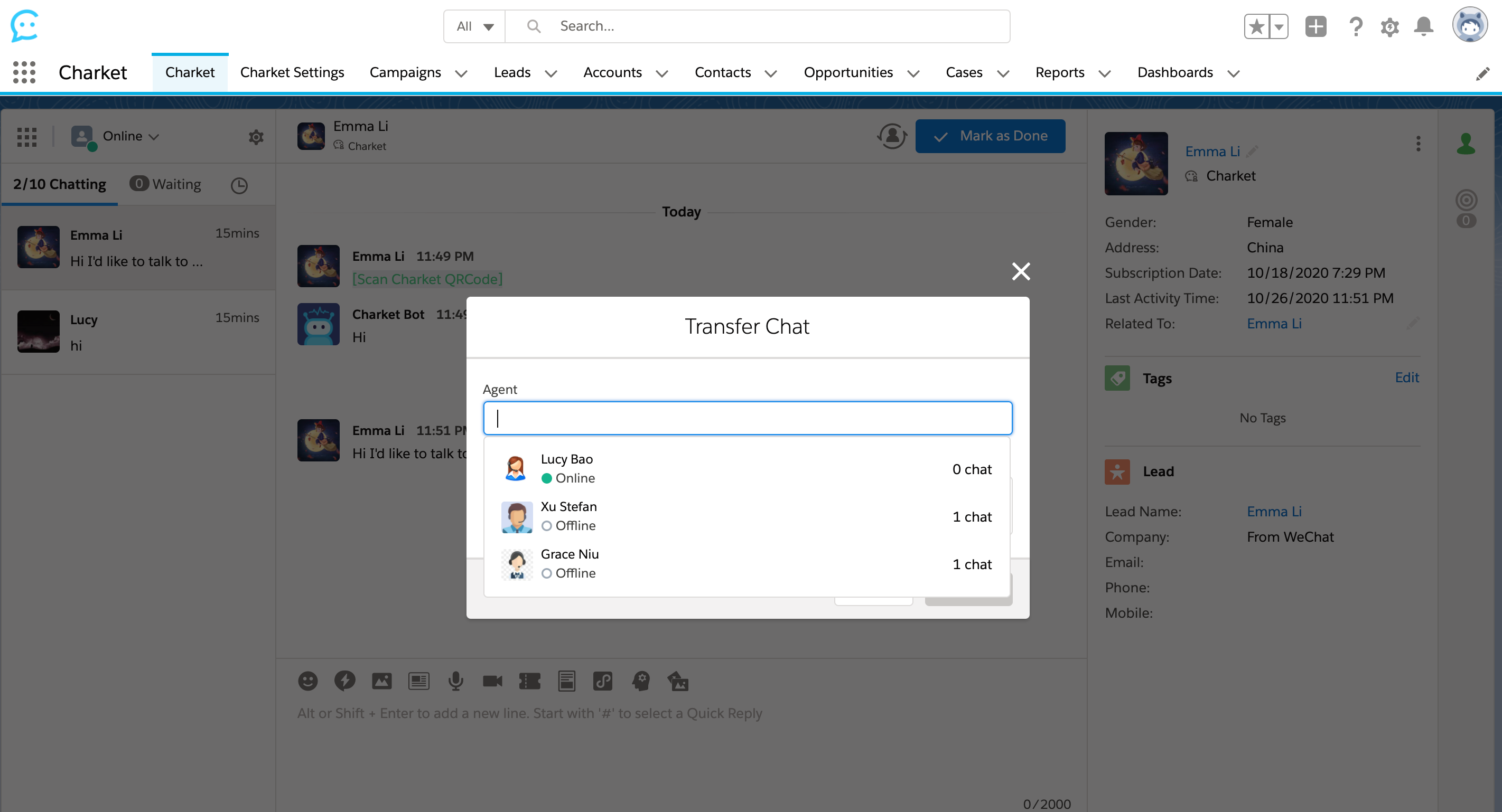 上一个版本中,客服的状态只通过图标显示,如果自定义了状态,将不能通过默认的图标体现出来。新版本解决了这个问题,Transfer 会话时在 Agent 名单中将精准显示每个客服的当前状态名称,包括 Online、Offline、Don’t Accept Chat 和更多自定义的状态等,更方便将客户会话转移给其他在线客服。