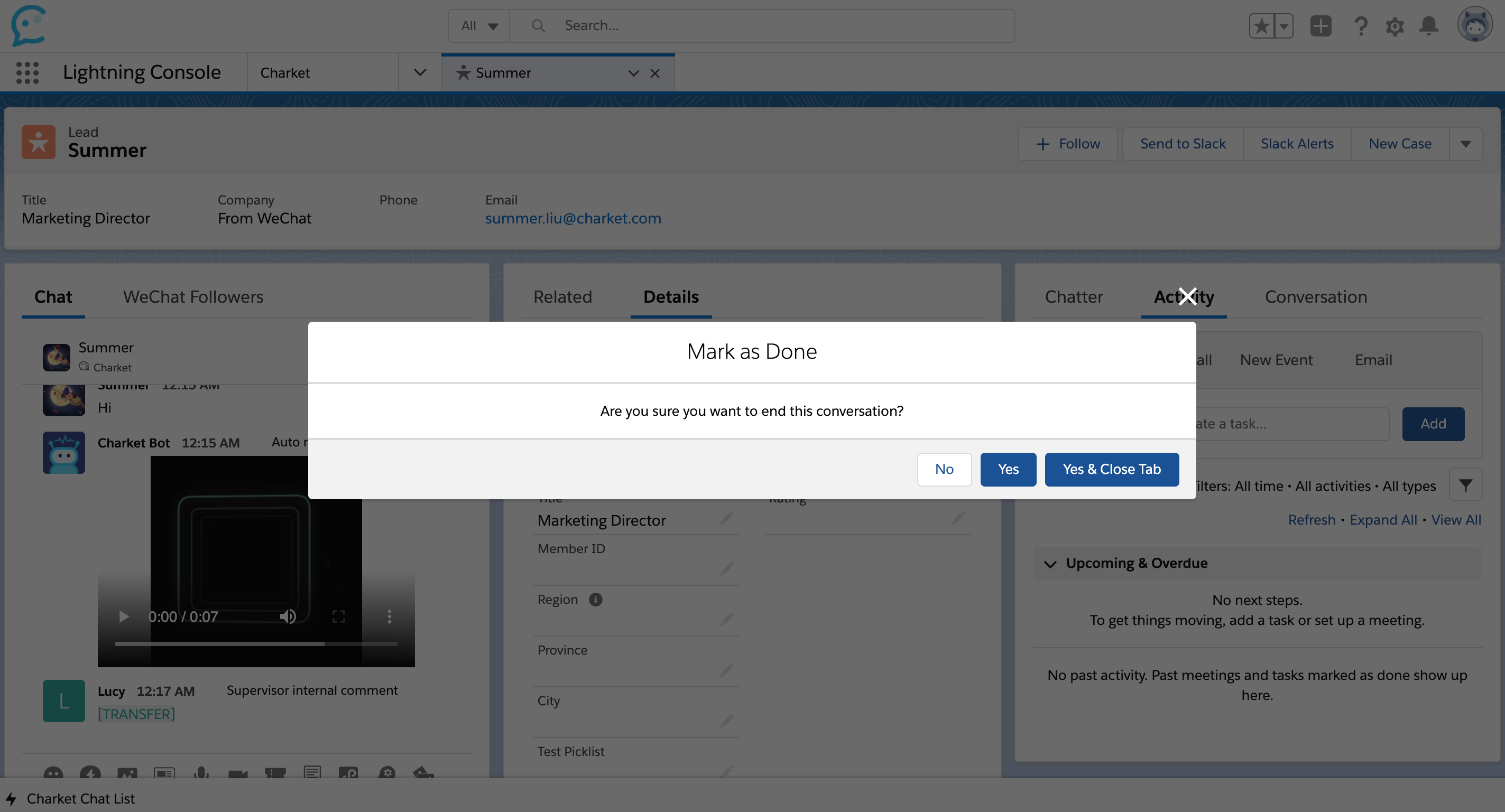 在旧版本中, Lightning Console 环境下如果客服要关闭一个会话时,在点击了 Yes 后就会关掉整个Tab,如果还要继续跟踪数据,则需重新打开页面,增加了客服的操作复杂度,影响了其工作效率。本次更新后,将一个会话 Mark as Done 时,点击 Yes 将只关掉会话,而不同时关闭 Tab。