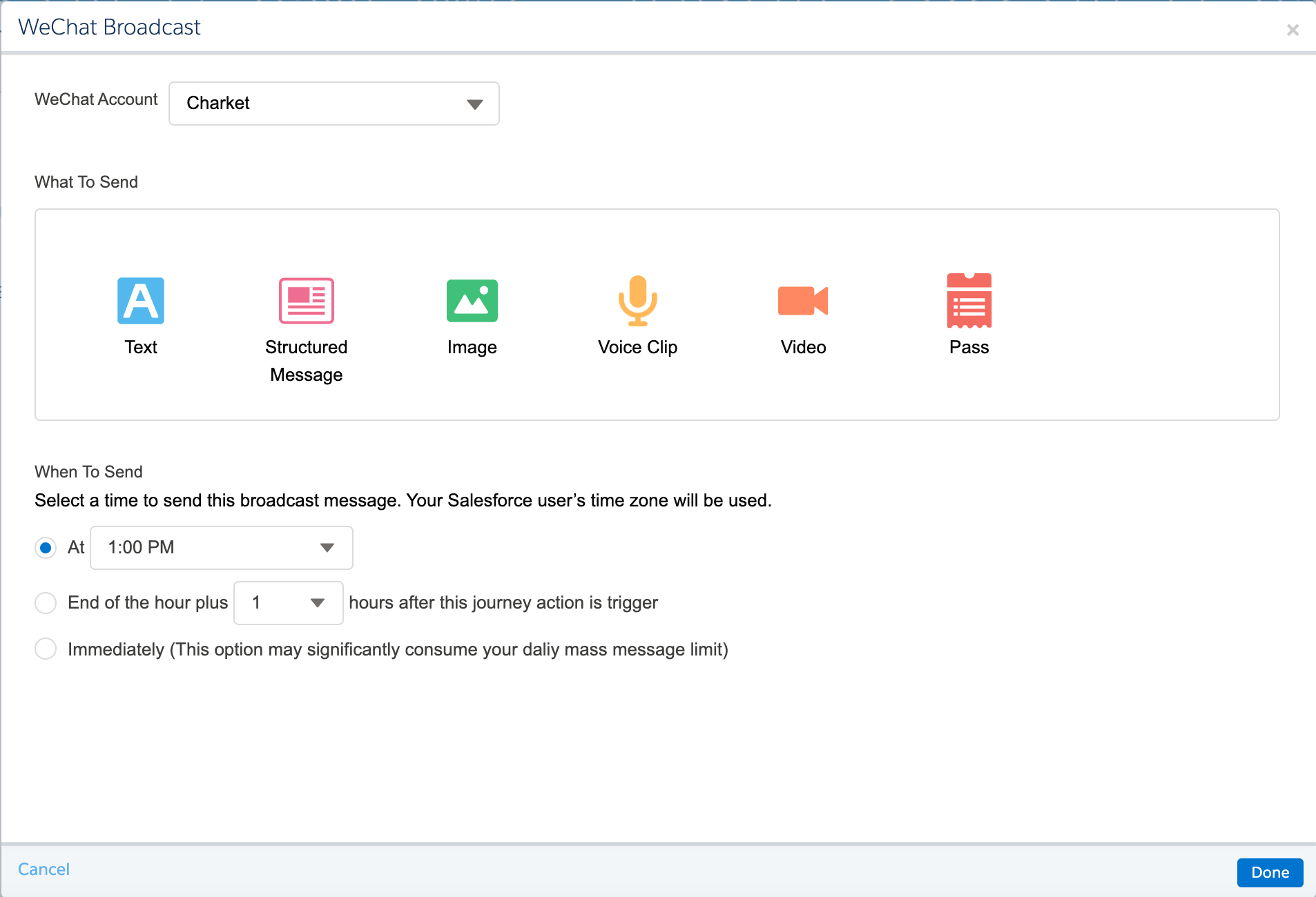 新版本支持 Marketing Cloud 的 Journey Builder 中使用 WeChat Broadcast Activity 在指定时间点群发消息。由于微信对群发次数的限制,旧版本中当进到 Journey Builder 的用户数过多时,在通过 WeChat Broadcast Activity 发送消息时很容易达到群发次数上限。因此新版本中用户在配置 Journey Builder 时,选择 WeChat Broadcast Activity 后,可以设置在指定时间点批量发送消息,减少群发次数的浪费。