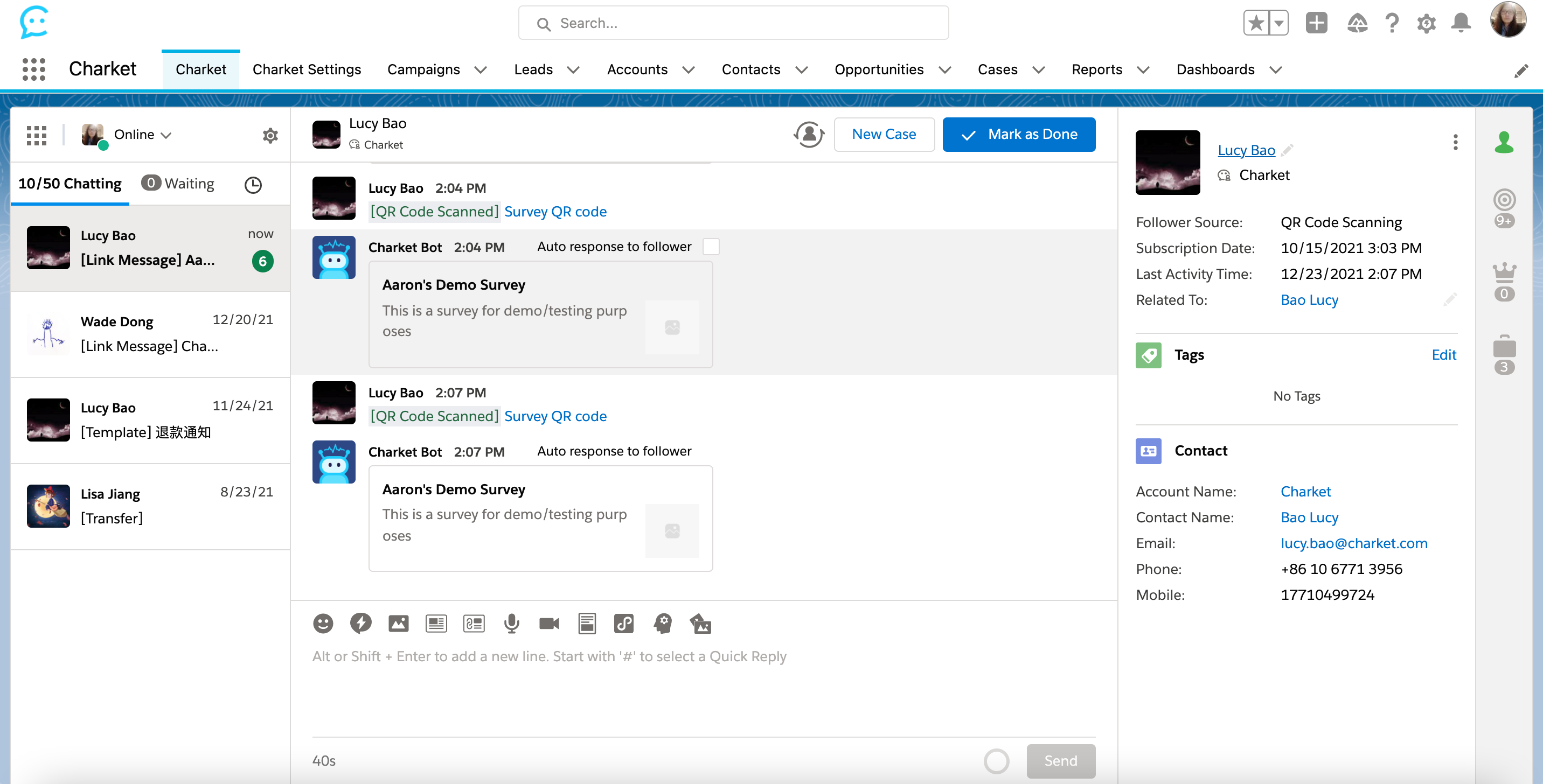 新版本中 Live Chat 适配了最新微信客服接口规则,客服可以给48小时内有互动的关注者继续回复消息;如果是全新关注者或关注者在48小时内未互动,则在关注者订阅公众号、点击菜单和扫描二维码后 1 分钟内客户可以最多回复三条消息,同时输入框会显示60s的时间定时,方便用户及时回复消息,超过1分钟后则无法回复,只有当关注者再次扫码,发送关键字或点击菜单时才可以发送。