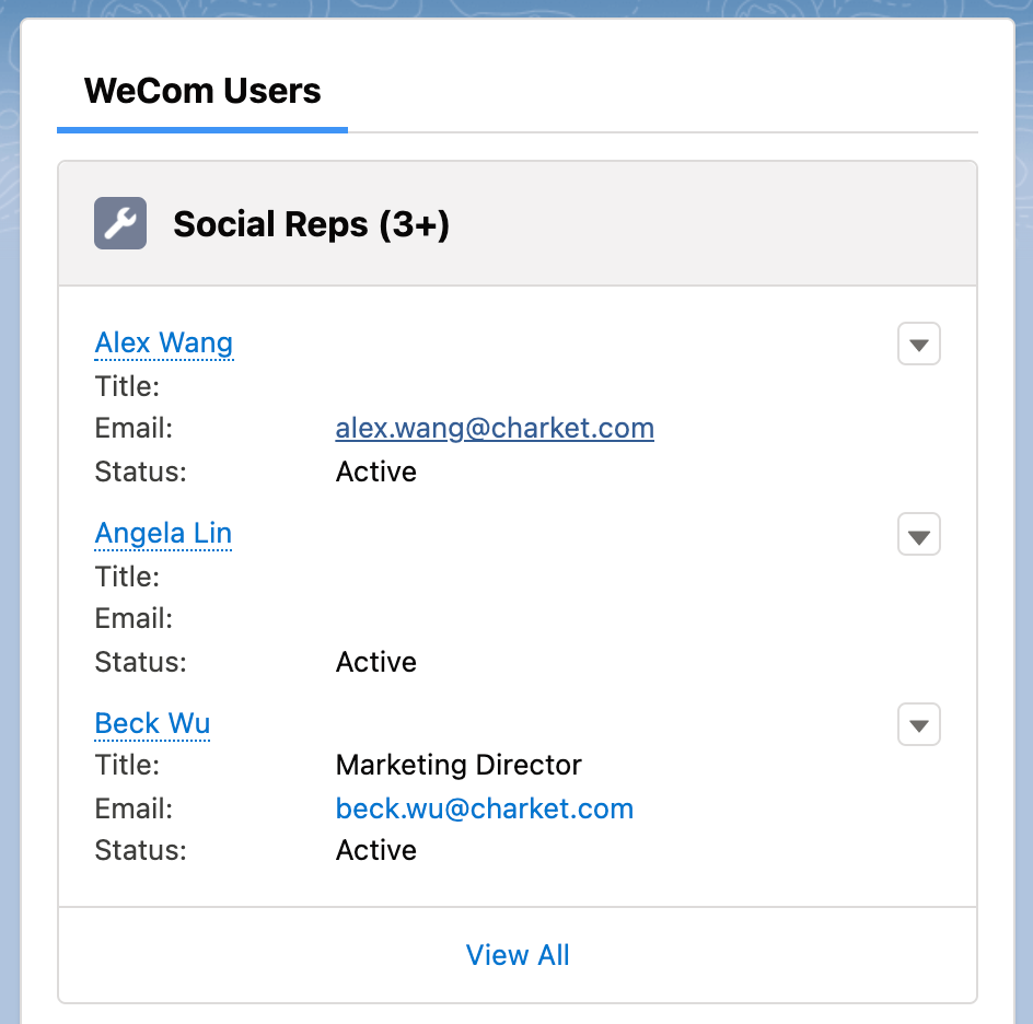 可以将有权限的每个成员的所有外部联系人同步到 Salesforce,并且关联到对应的成员下面,查看当前外部联系人与哪些企业微信用户是好友关系。