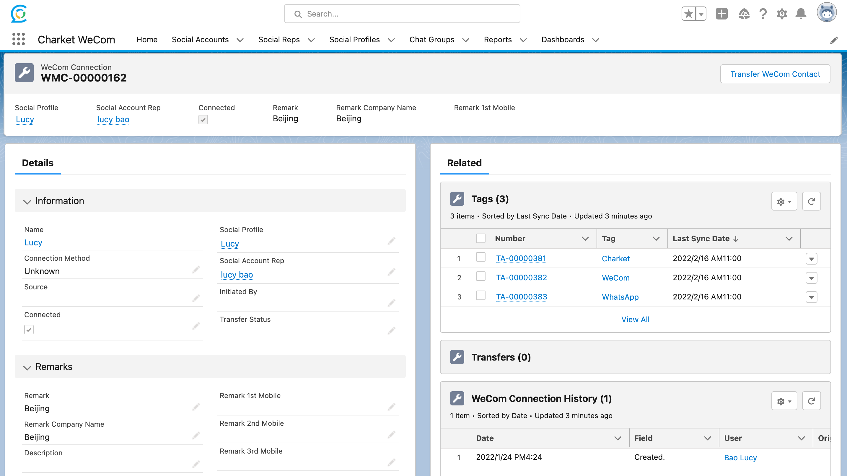 Charket WeCom 强大的同步功能可将企业微信成员 (WeCom Users)、外部联系人(WeCom Contacts)、标签及标签组(WeCom Tags),以及聊天群(Chat Groups)等数据导入 Salesforce,并在 Salesforce 中查看和管理企业微信数据。