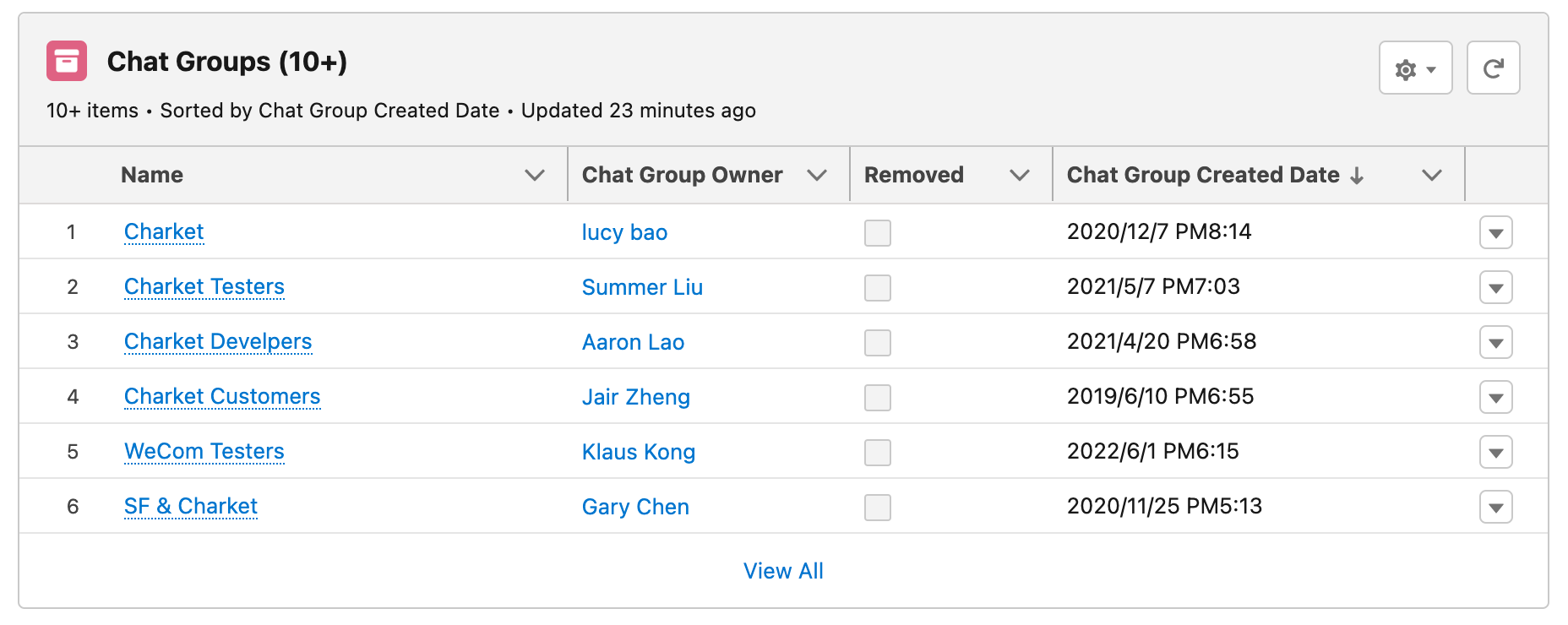 通过 Charket WeCom 将企业微信的聊天群、群成员信息同步至 Salesforce。可以查看每个外部联系人所在的所有聊天群以及群成员信息,还可以查看每个企业微信成员所创建的聊天群或该成员所在的聊天群信息。并可关联到群成员的 Lead/Contact,查看当前 Lead/Contact 参与了哪些聊天群。方便用户在 Salesforce 中查看企业微信聊天群的活跃程度,同时考察员工的工作绩效。