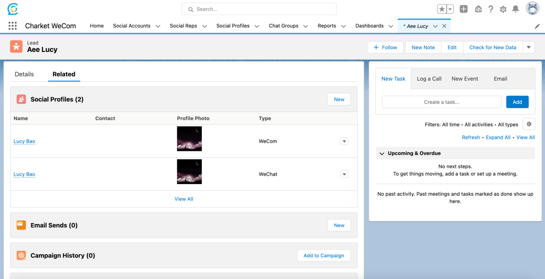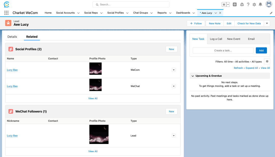 企业在 Salesforce 中同时安装了 Charket WeChat 和 Charket WeCom 两种应用,既绑定了微信公众号又绑定了企业微信账号。如果在不同应用下有同一个微信用户,则在同步数据后,该用户在微信公众号中关联的 WeChat Follower 和企业微信中关联的 Social Profile 将会关联到同一个 Salesforce Lead/Contact 上,方便企业查看和统计用户在不同微信平台上的数据。