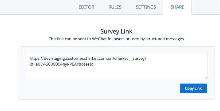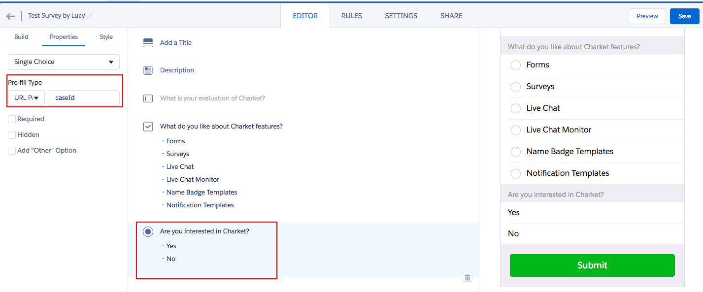 在 Charket 中创建一个 Survey,并设置 URL Parameter(如 caseId)给一个被 Hidden 的 Survey Question。