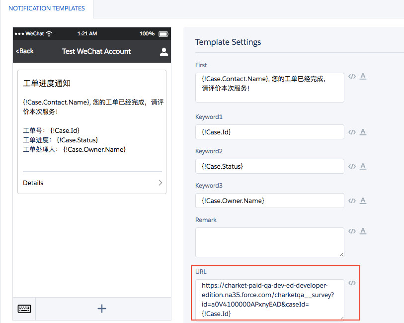 在 Charket 中创建一个模板消息,关联对象为 Case。