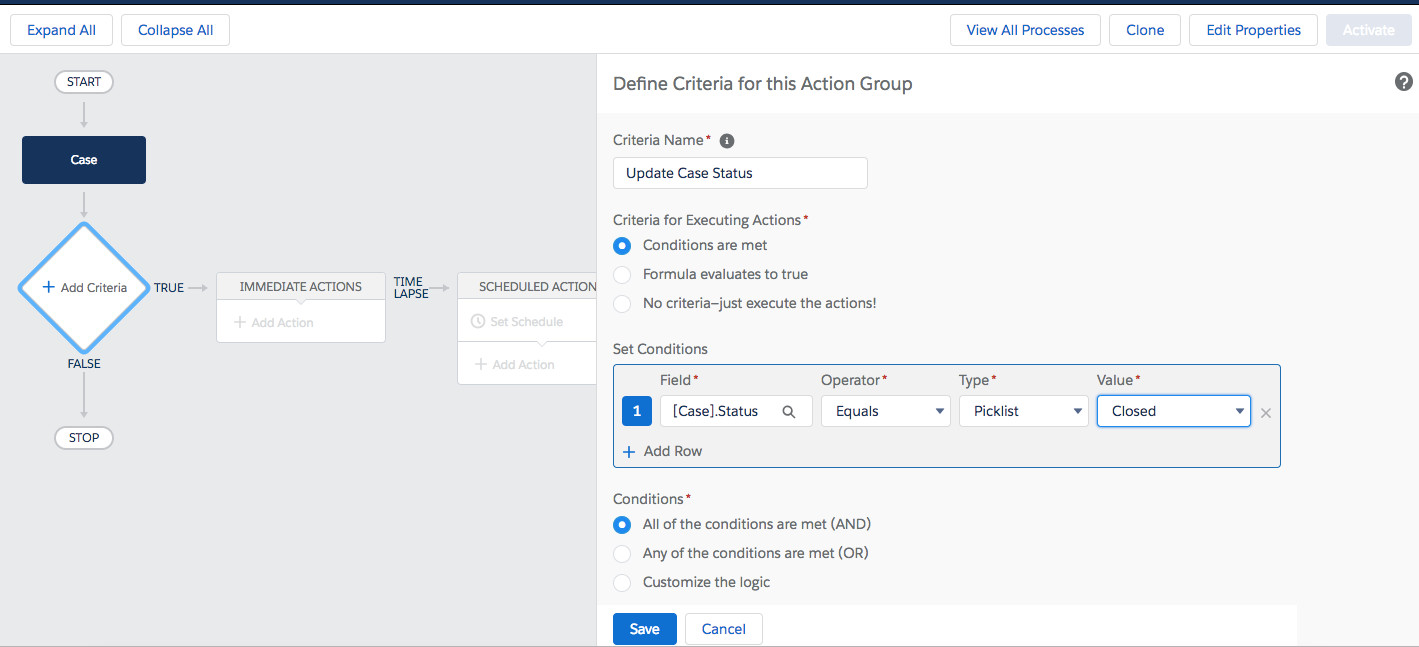 登录 Salesforce,进入 Setup | Process Builder ,新建 Process Builder,选择 Object 为 Case。 在 Add Criteria 页面配置如下图所示:
