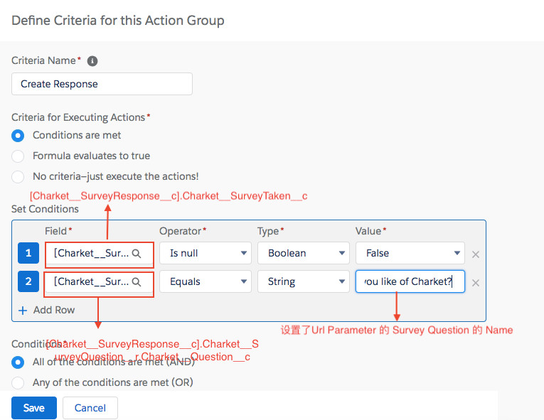 登录 Salesforce,点击 Setup | Process Builder 新建 Process Builder,选择 Object 为 Survey Response。在 Add Criteria 页面配置如下图所示: