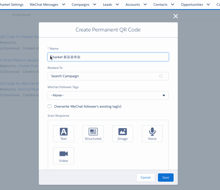 首先,您需要登陆 Salesforce,进入 Charket。通过左侧导航栏进入二维码(QR Code)界面,然后新建微信二维码。在新建微信二维码界面,您可以设置以下项目:
